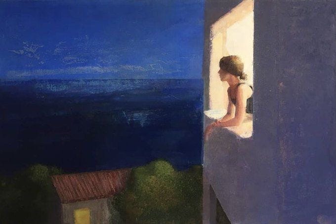 كانت تجلس قرب النافذة في تلك العتمة الساحرة التي تسبق الفجر،تُحدق في السماء الخالية من الضوء
